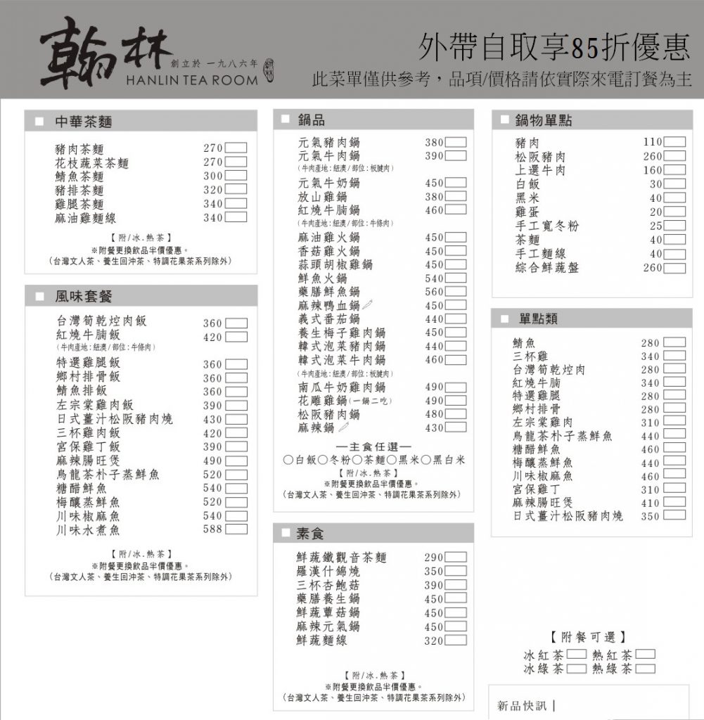 翰林茶館 》翰林外帶:安心抗疫 翰林陪你挺過去!外帶自取85折